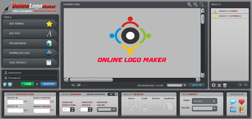 We'll now walk through the main features of Online Logo Maker together: in the beginning you'll see a couple of objects already there in the object list: